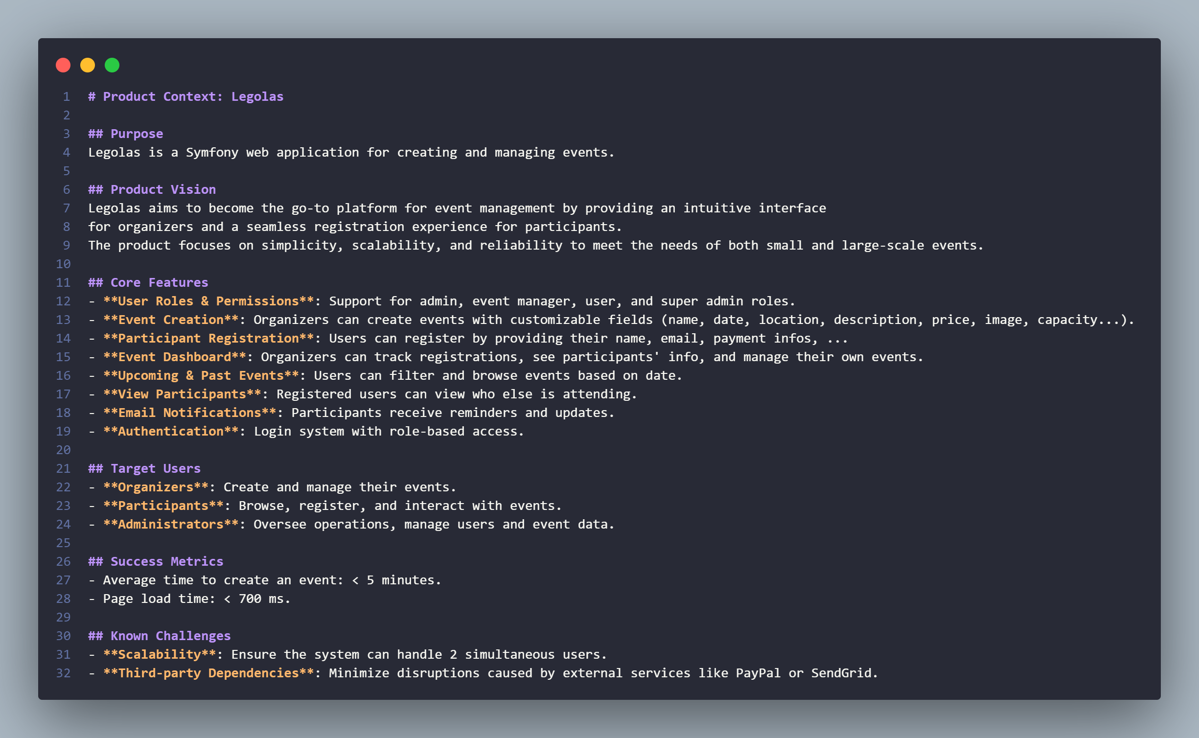 Le fichier Product Context – Présente la vision et les objectifs de l'application web nommée pour le développement Legolas, développée avec Symfony pour la création et la gestion d’événements. Il définit les rôles utilisateurs (administrateur, organisateur, participant), les principales fonctionnalités (création d’événements, inscriptions, tableau de bord, filtres, notifications par e-mail, authentification), ainsi que les indicateurs de performance et les défis techniques liés à la scalabilité et aux dépendances externes. Ce document sert de base de référence pour guider le développement du projet et assurer sa cohérence fonctionnelle.