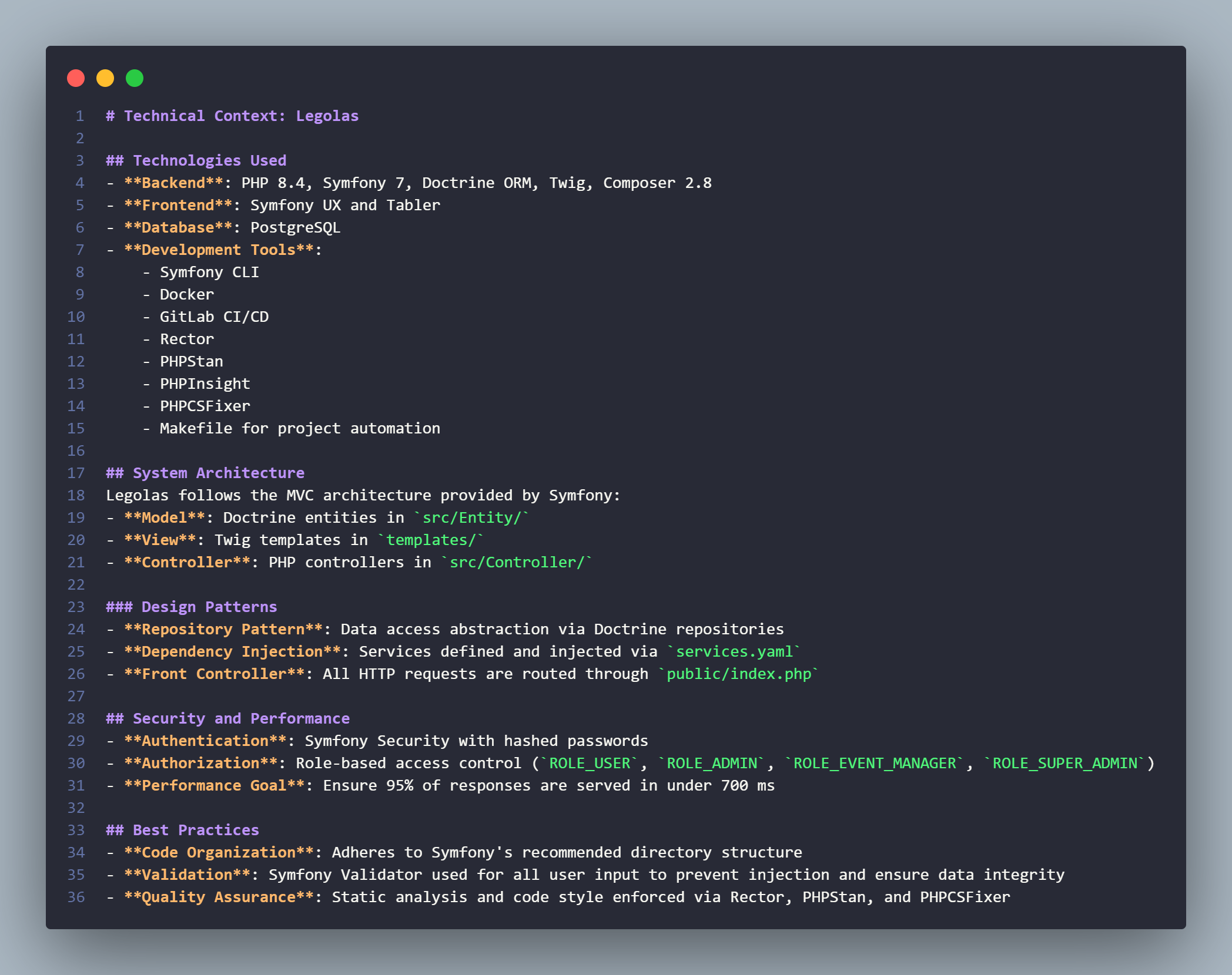 Le fichier Technical Context – Décrit l’environnement technique et l’architecture du projet Legolas. Il précise les technologies utilisées (PHP 8.4, Symfony 7, Doctrine, Twig, PostgresSQL, Docker, GitLab CI/CD, etc.) et détaille l’organisation du code selon le modèle MVC de Symfony. Il met en avant l’usage de plusieurs design patterns (Repository, Dependency Injection, Front Controller) ainsi que les bonnes pratiques appliquées en matière de sécurité, performance et qualité du code. Ce document sert de référence technique pour assurer la cohérence, la maintenabilité et la fiabilité du projet.