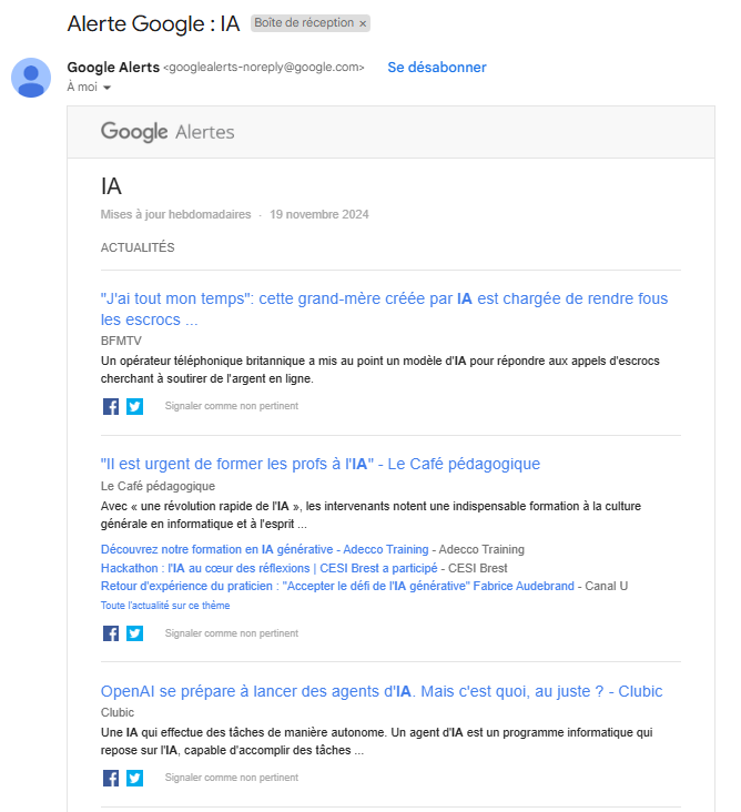c’est une alerte Google qui est un email envoyé par Google listant toutes les pages web qui ont mentionné le mot ou l’expression sur laquelle